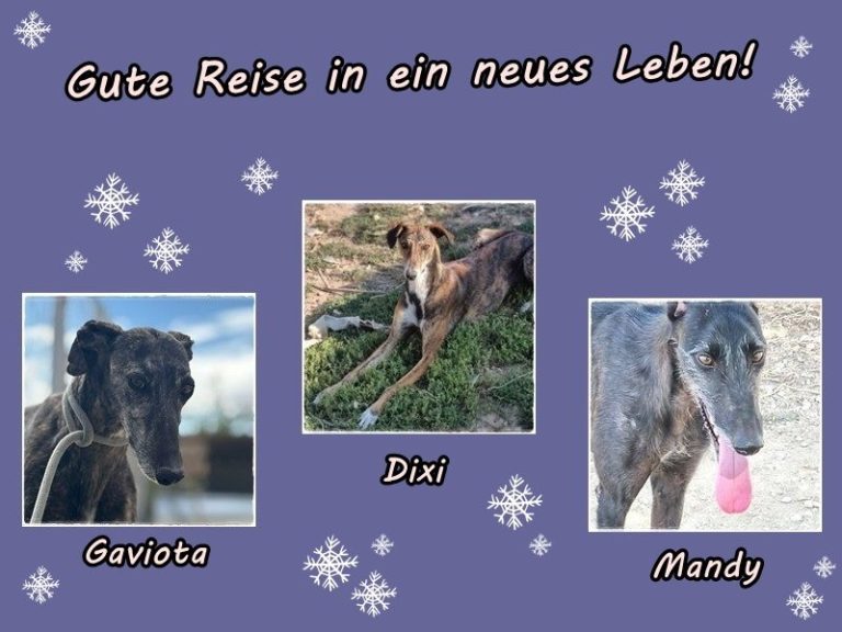Wir freuen uns sehr für den lieben GANGA, den fröhlichen MERLiN und den schönen Galgo DiABLO. Sie haben eine Pflegefamilie gefunden und werden demnächst vorgestellt damit sie noch ihre Dosenöffner finden können!